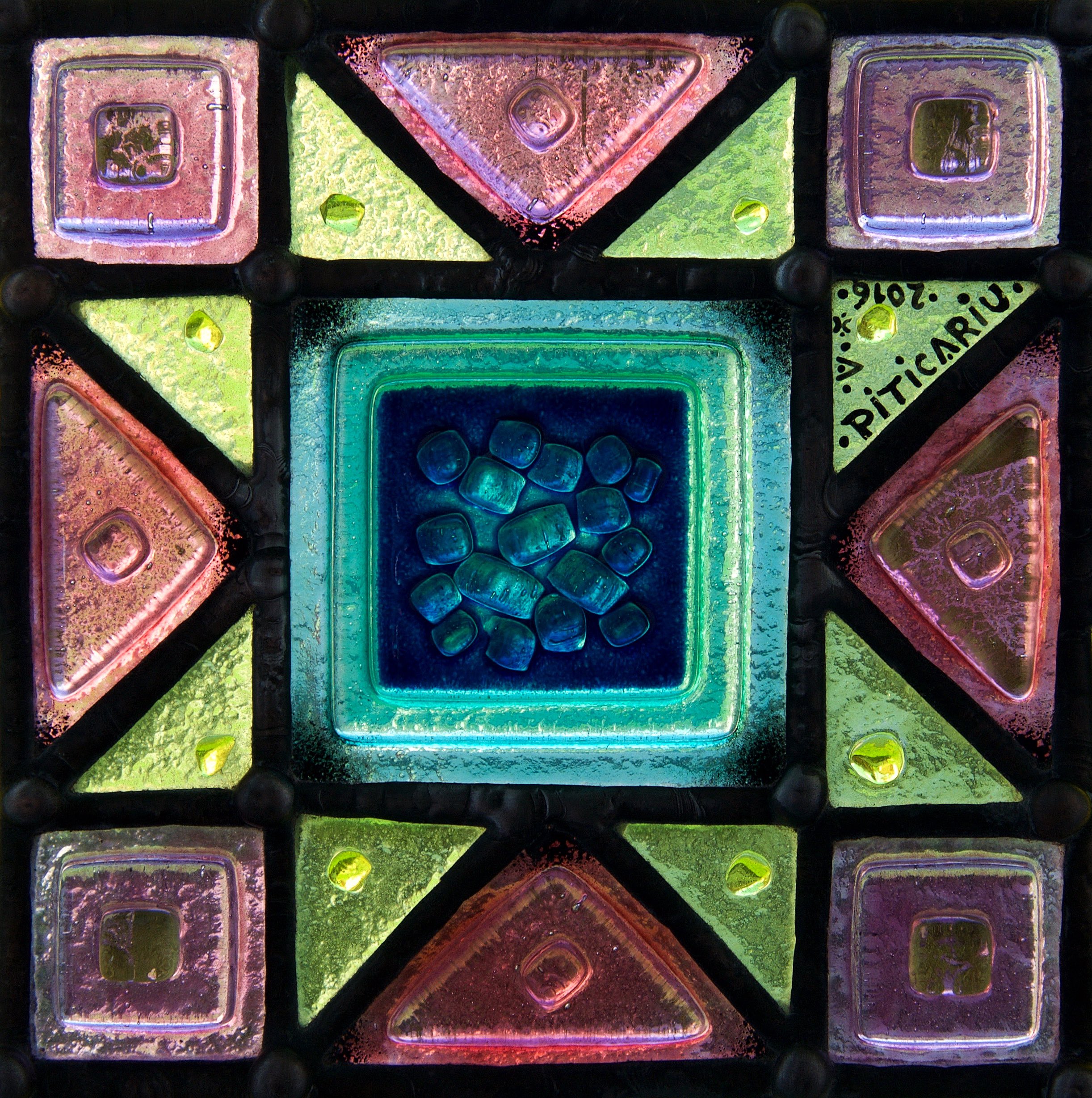 A very special Tiffany stained glass made with fused glass in five layers and with gold plated glass.